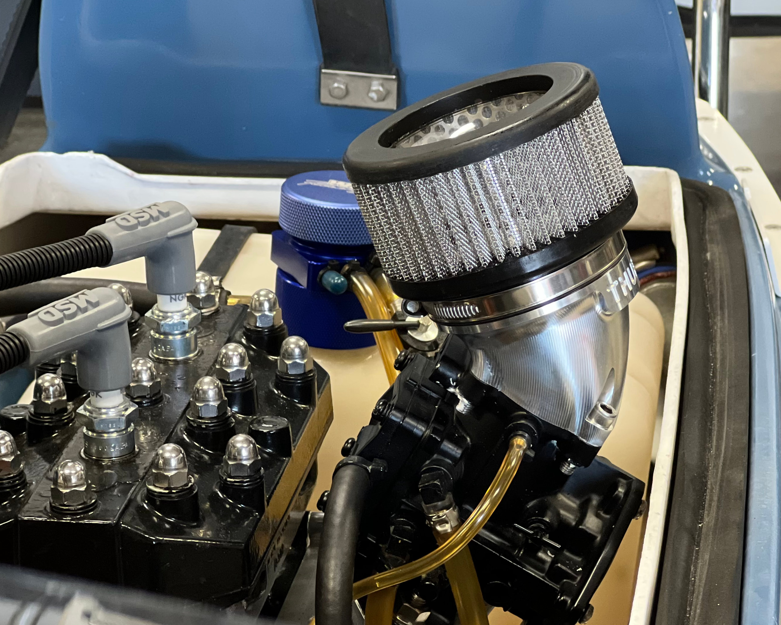 5 Axis Billet T6061 Aluminum machined adapter, to fit Mikuni SBN Carburetors. 2.75" OD top clamp surface for the Flame Arrestor. This was specifically designed to make standard Prok, Tau Ceti, Hot Products Flame Arrestors fit inside the JS440/JS550/550SX hood with, our angled Kawasaki 440/550 Performance intake, but should work great with the original Ocean Pro 45 degree intake also.